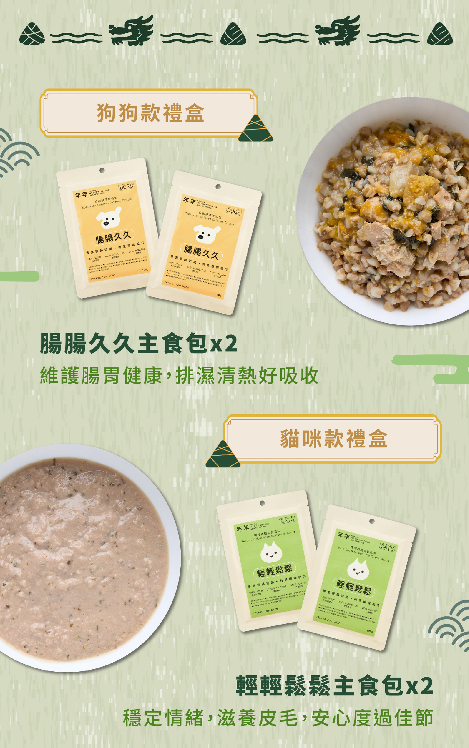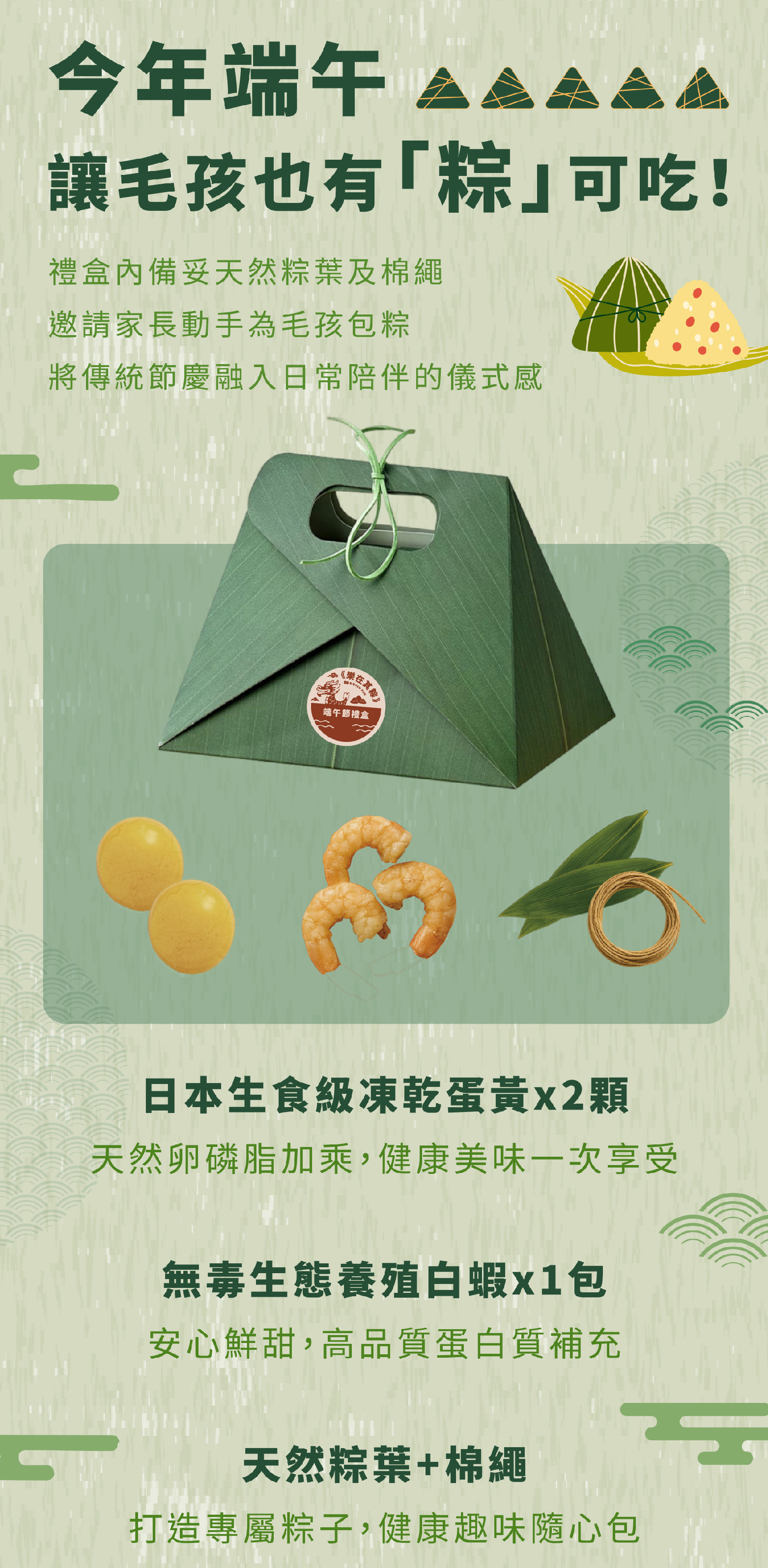 【樂在其粽】端午禮盒一組包含主食鮮食包2入+蛋黃凍乾2顆+白蝦凍乾3尾