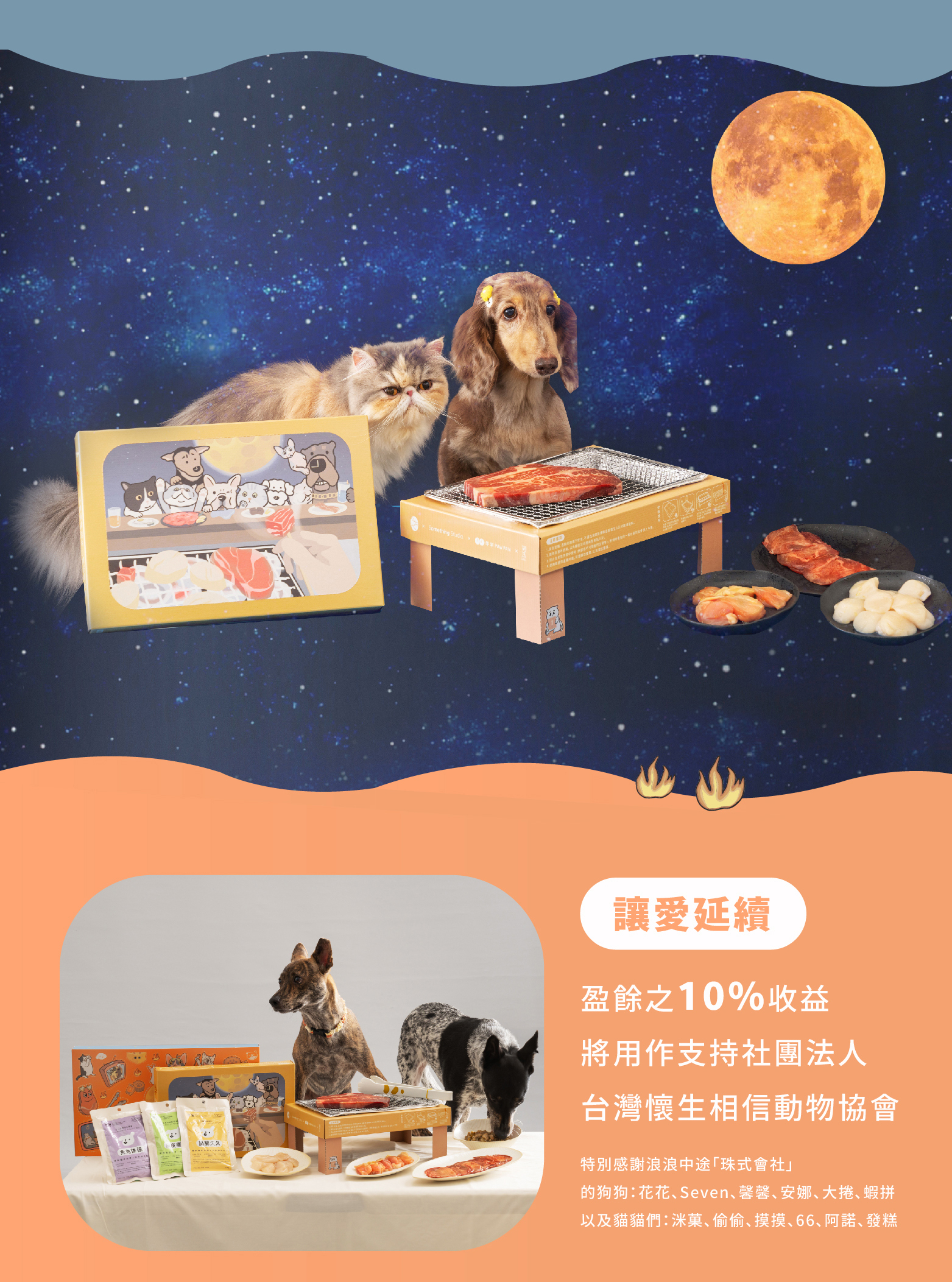 烤肉架(底座)*1、鋁箔盒(爐體)*1、烤網*1、肉球烤肉夾*2、固定夾*2、速燃炭、炭夾*1